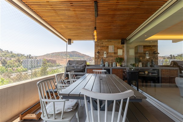 Cod.TGP: 1001297 Espectacular departamento 100% remodelado, sector Lo Gallo, piso 8 de 8 con maravillosa vista panorámica, despejada y asegurada al cerro Manquehue. Orientación Nor-Oriente. Amplios espacios, pallier, hall de entrada, living comedor separado con gran terraza con quincho incorporado. 3 dormitorios, 2 en suite. Sala de estar, servicios completos. Dormitorio principal con terraza y con gran baño, muy iluminado y con walking closet. Dormitorio 2 y 3 con vista despejada al sur. Gran cocina con isla y artefactos Bosch y gran loggia. Ascensor principal y de servicio independiente. 3 estacionamiento grandes y con gran bodega. Muy buena conectividad. Entrada al edificio por Las Tranqueras Norte y por Padre Damián de Veuster. Muchos estacionamiento de visita. Muy tranquilo. A pasos del Colegio Manquehue, frente al parque de Monseñor Escriba de Balaguer. Edificio cuenta con dos piscina ( Adulto y niños) GC $ 450.000 BSRS $ 1.100.000 C/C